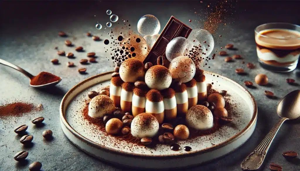 Imagine esferas de café que estouram com um toque, liberando o sabor intenso que normalmente permeia os biscoitos; uma espuma aerada de mascarpone que derrete instantaneamente na língua; biscoitos transformados em um pó crocante que adiciona textura inesperada; e um gel de marsala que intensifica o sabor alcoólico característico. Todos esses elementos são dispostos artisticamente no prato, criando uma apresentação visualmente deslumbrante que convida à exploração e à descoberta.